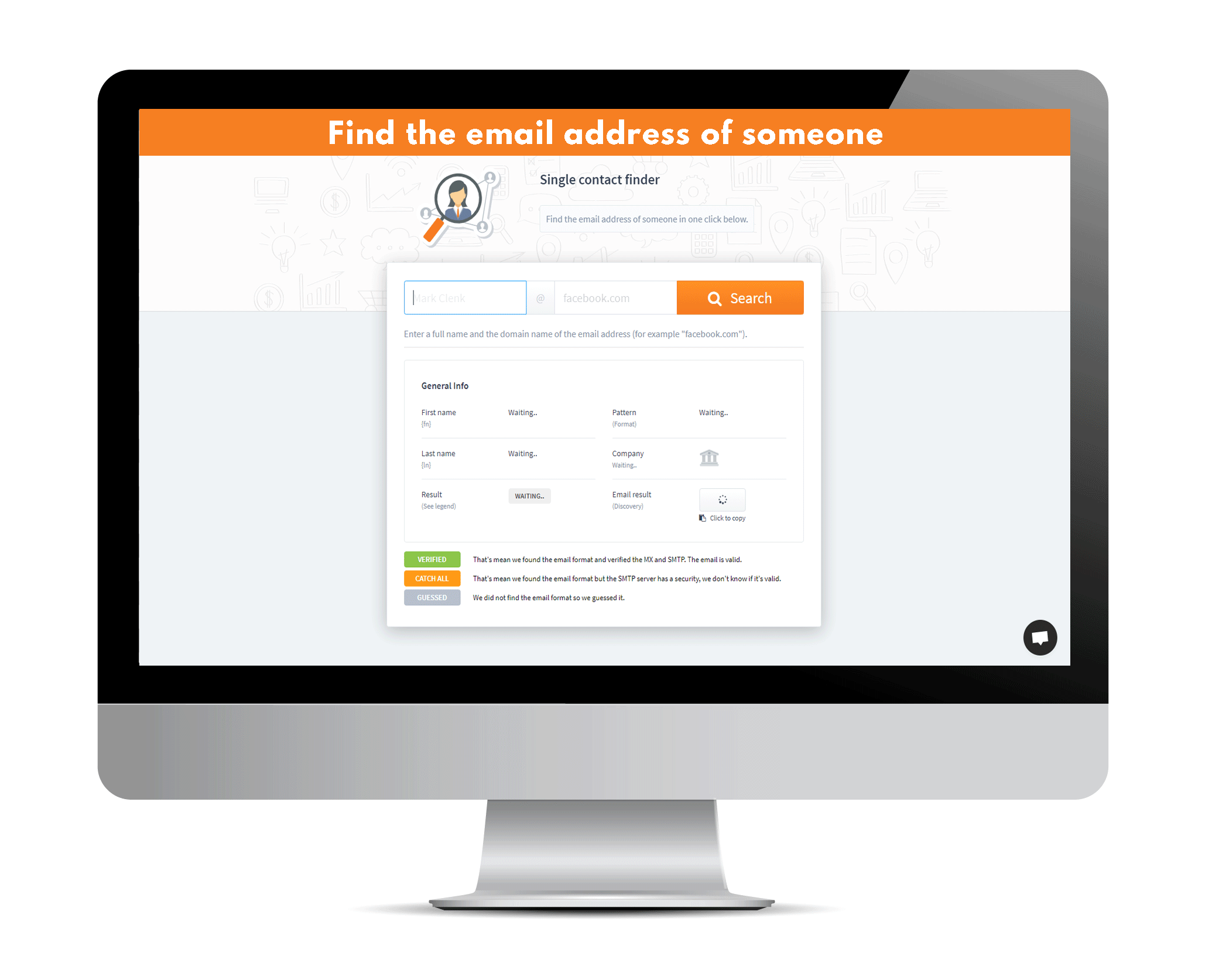 From a list with first name, last name, company name or domain, find email addresses and contact information.